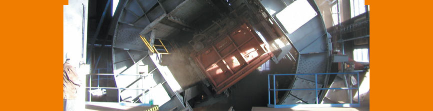 The wagon makes a 180°-turn and empties over the coal bunker. The e-chain® secures the energy supply of the rotating device.